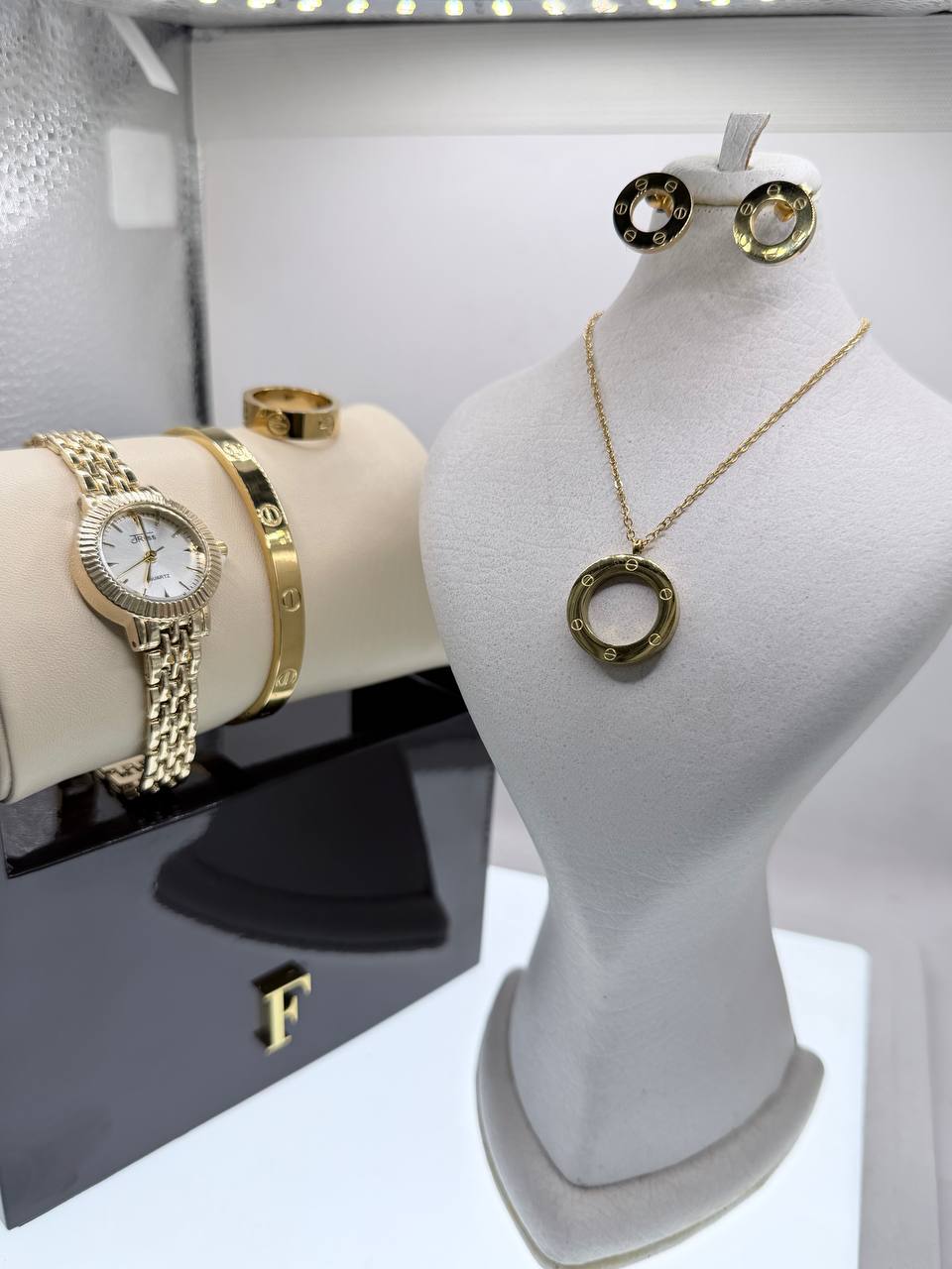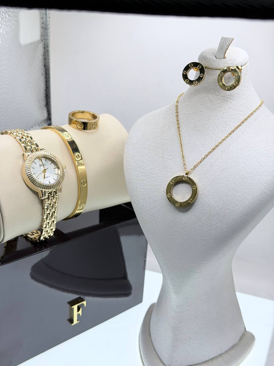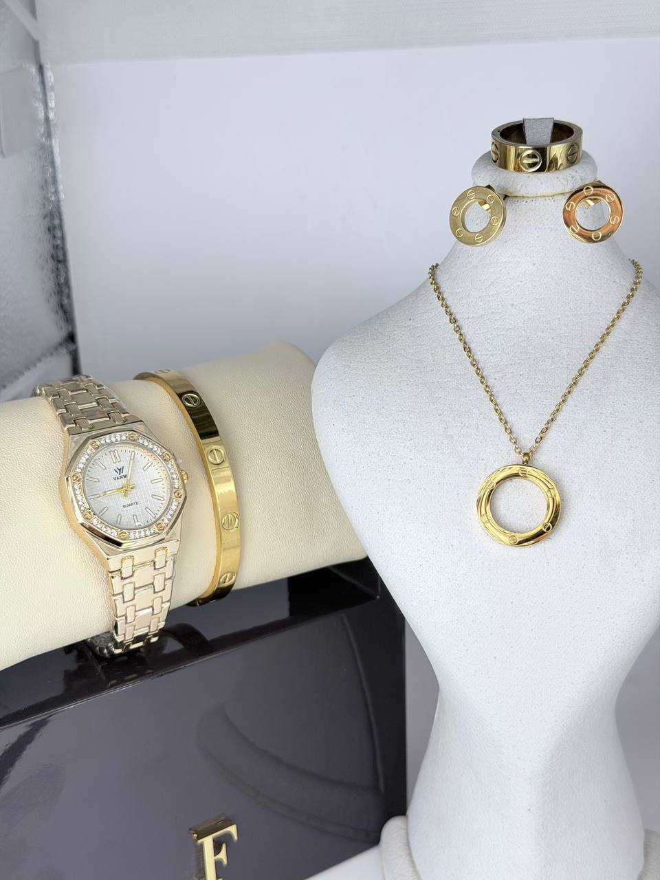 ساعت برند جریس ست کارتیه طرف لاو گردبند گوشواره دسبند و حلقه استیل درجه یک کیفیت استیل بالا