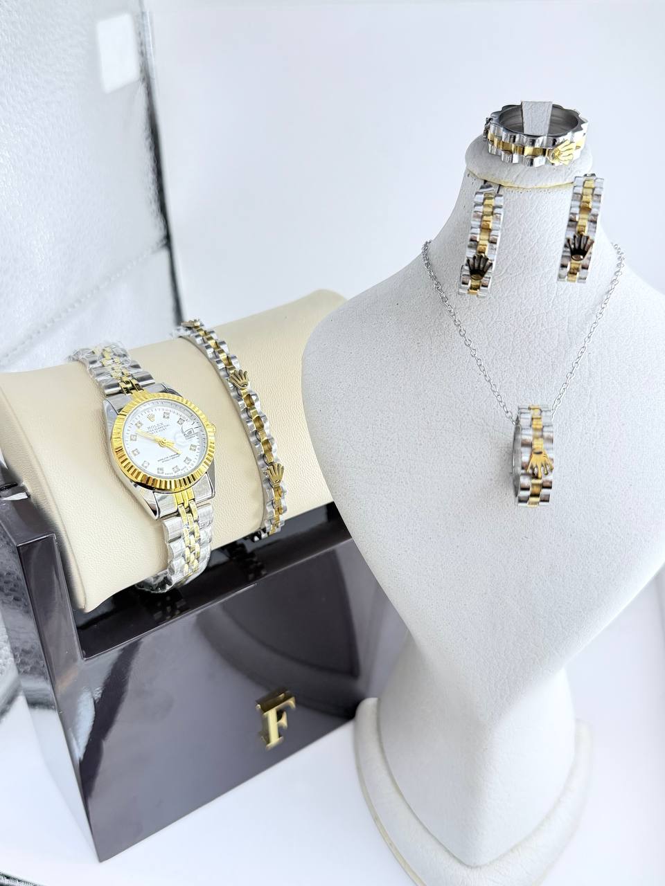 ساعت رولکس تقویم دار طرح دیجاست و تمام ست کامل رولکس تاج دار گردنبند و گوشواره و حلقه و دسبند طراحی جدید و خاص