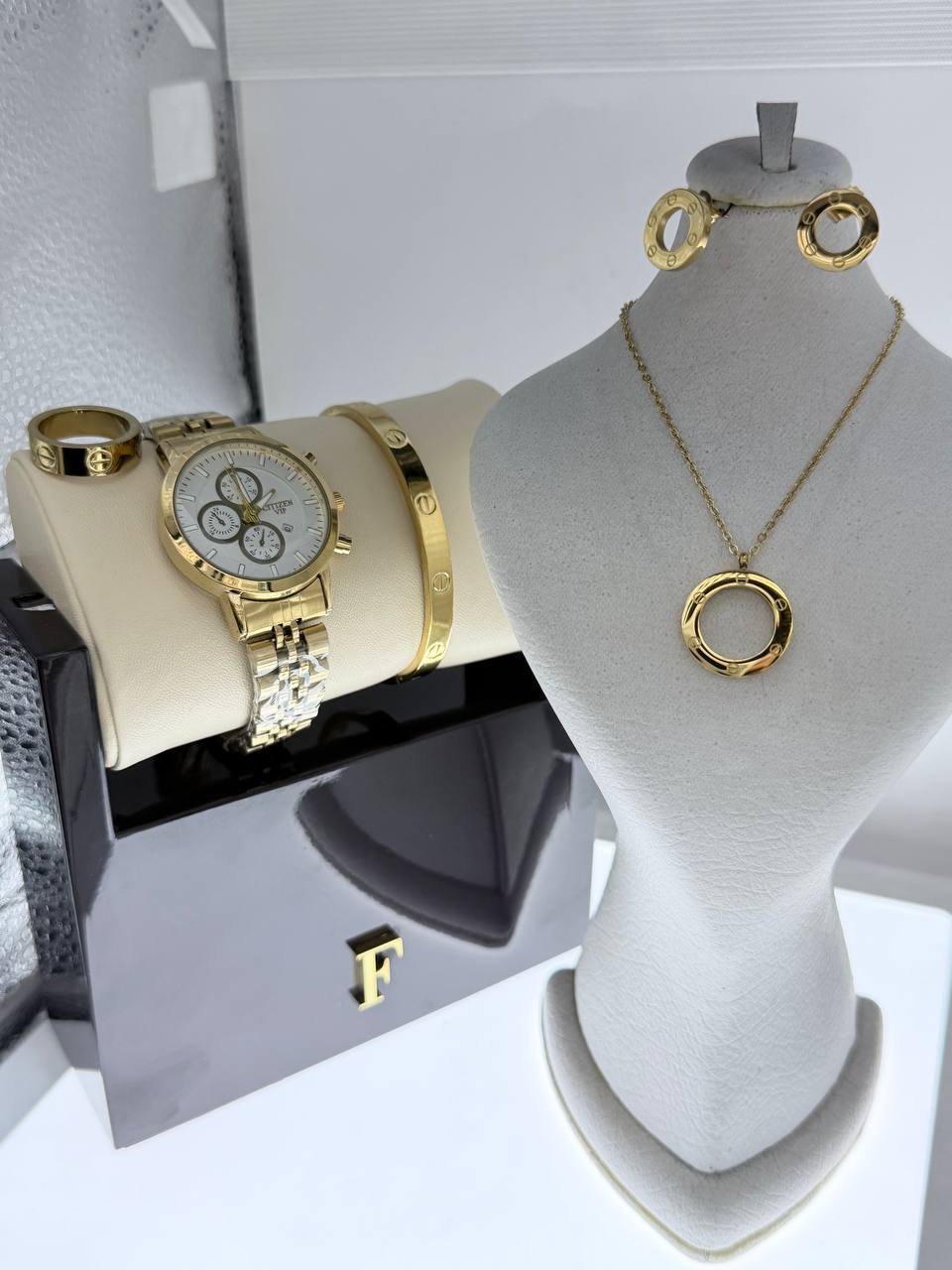 ساعت برند سیتیزن طرح سه موتوره تقویم دار ساعت اف خورده و گردنبند گوشواره دسبند و حلقه استیل درجه یک کیفیت استیل بالا