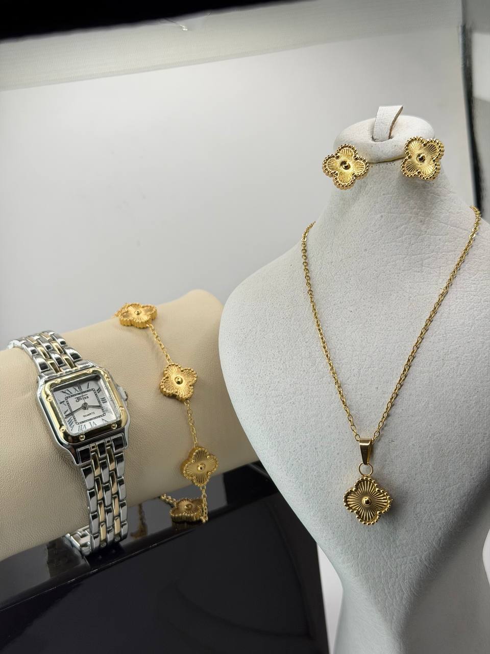 ساعت برند جریس ست کارتیه طرف لاو گردنبند گوشواره دسبند و حلقه استیل درجه یک کیفیت استیل بالا