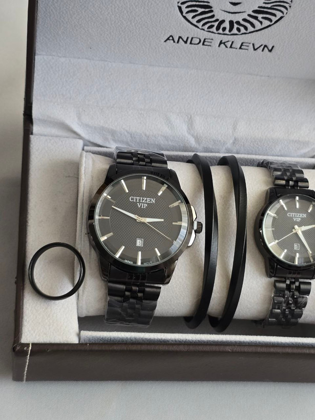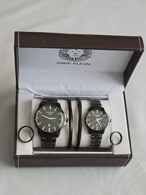 ست ساعت زنانه و مردانه سیتیزن بند استیل ساعت ها دارای روزشمار دو عدد بنگل و حلقه (سایز 6 تا 10) به همراه جعبه کادویی و باتری یدکی