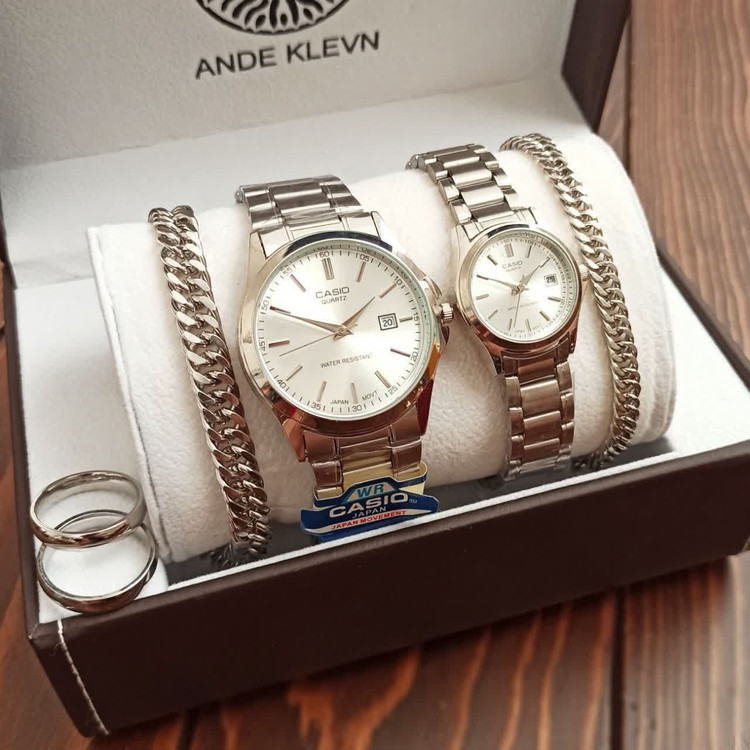 ست ساعت زنانه و مردانه برند کاسیو ساعت ها دارای روزشمار دو عدد دستبند کارتیر استیل و دو تا انگشتر