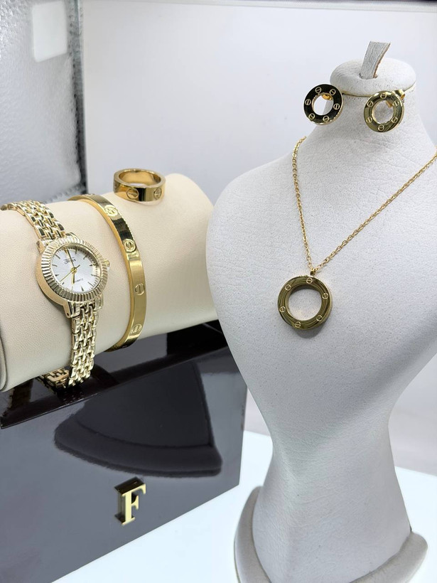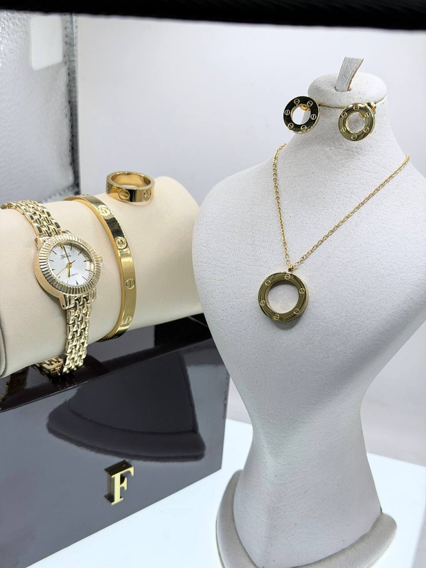 مشخصات محصول: ساعت برند جریس ست کارتیه طرف لاو گردبند گوشواره دسبند و حلقه استیل درجه یک کیفیت استیل بالا