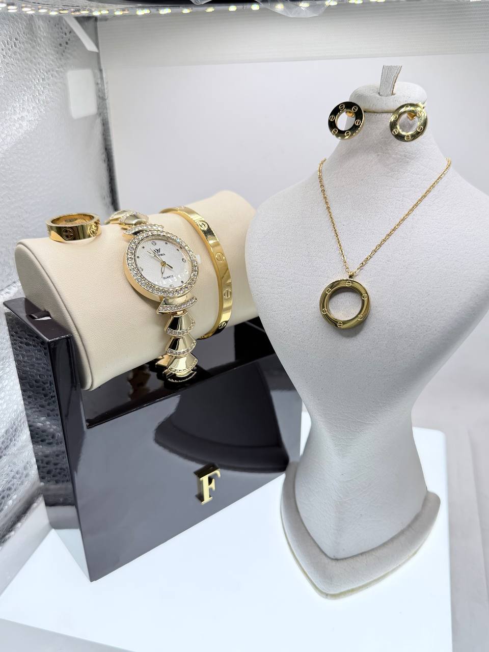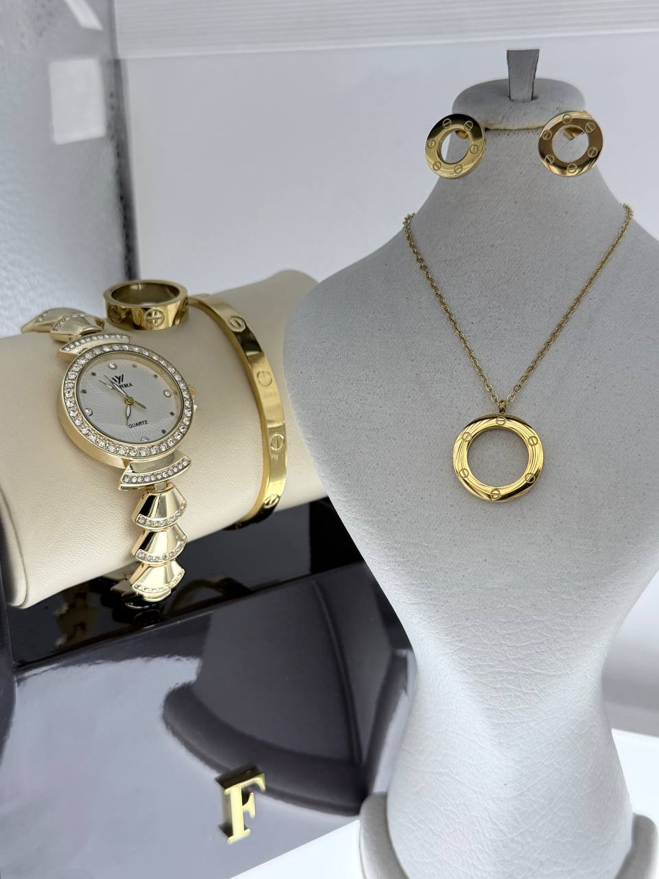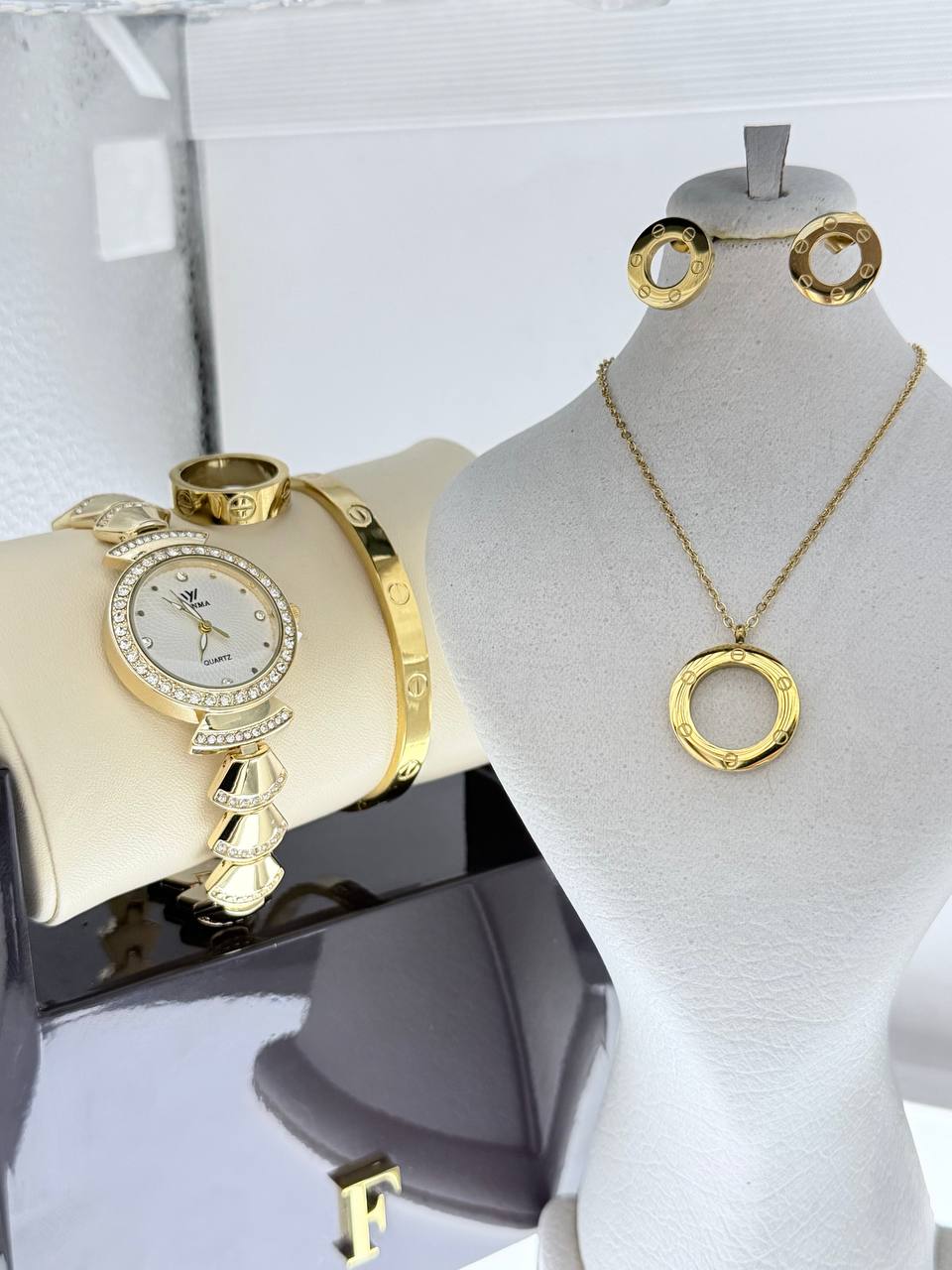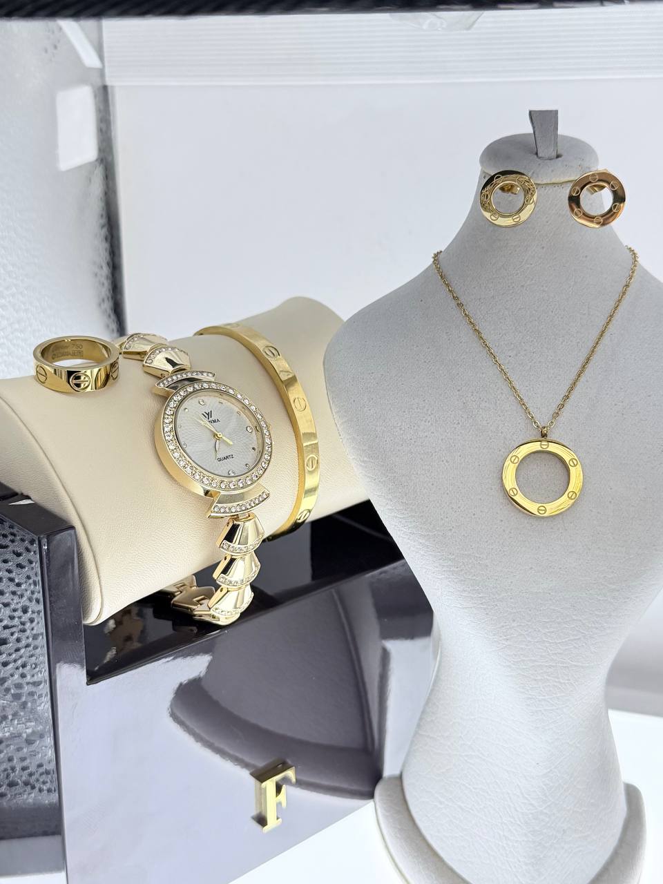 ساعت برند وانما واشر دار کیفیت قاب و بند استیل ساعت و ست کارتیه طرف لاو گردنبند گوشواره دستبند و حلقه استیل درجه یک کیفیت استیل بالا