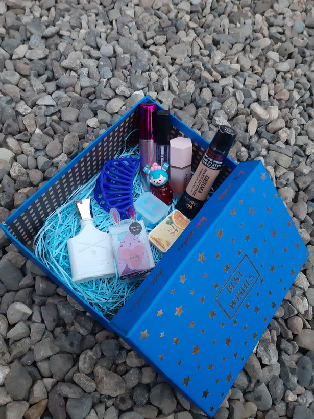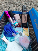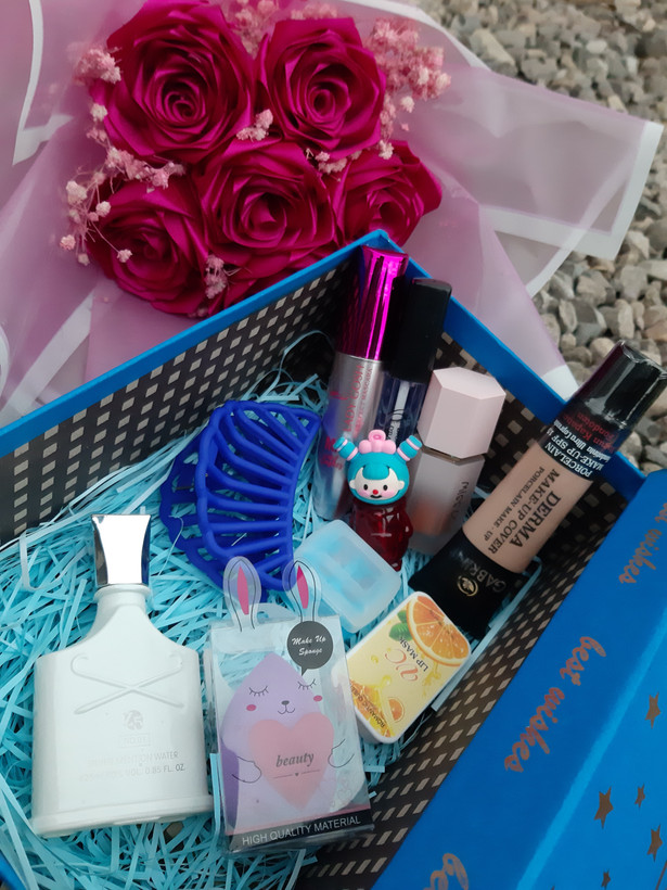 اقلام باکسشامل رژگونه پددار کرم پودر گابرینی پد تخم مرغی کلیپس ادکلن چرب لب پرتقالی تینت عروسکی ریمل حجم دهنده تقویت مژه تراش دو قلو