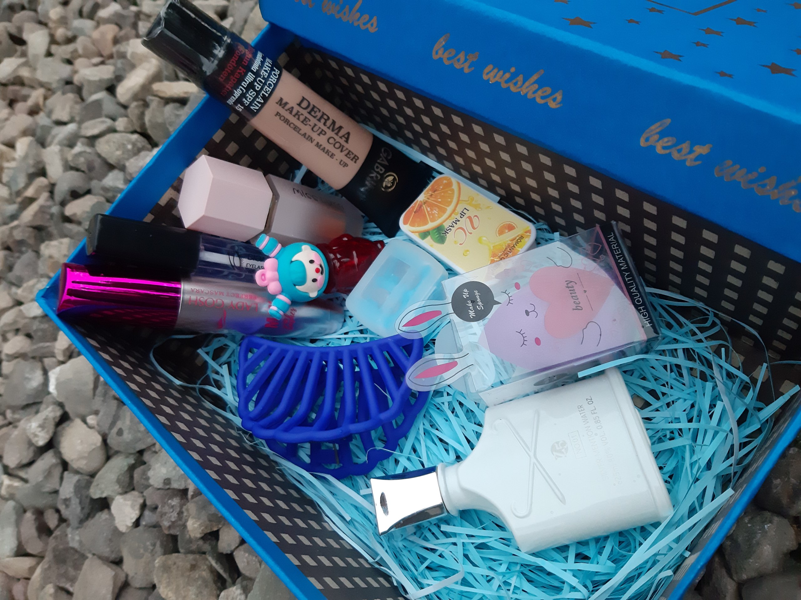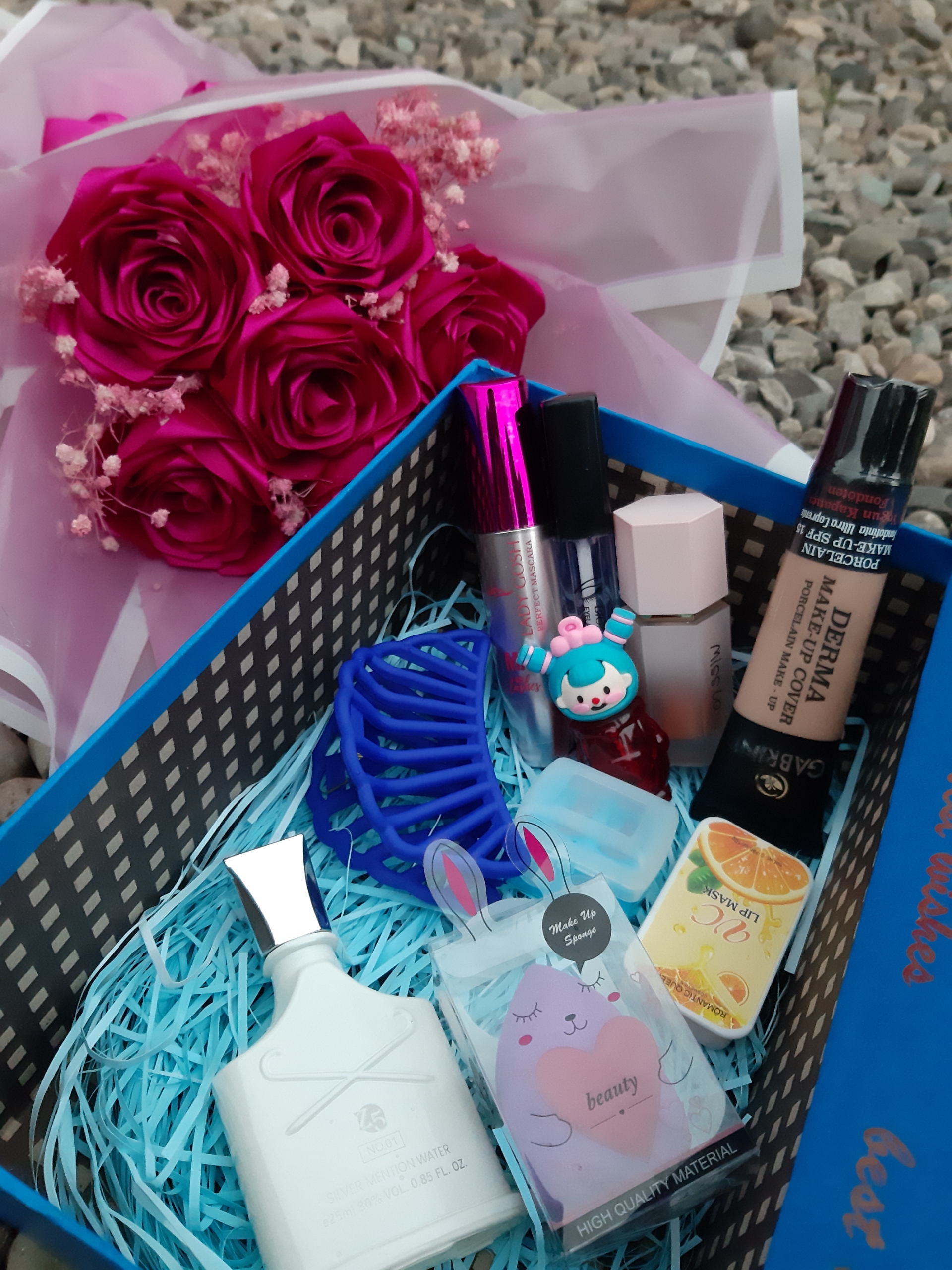 اقلام باکسشامل رژگونه پددار کرم پودر گابرینی پد تخم مرغی کلیپس ادکلن چرب لب پرتقالی تینت عروسکی ریمل حجم دهنده تقویت مژه تراش دو قلو