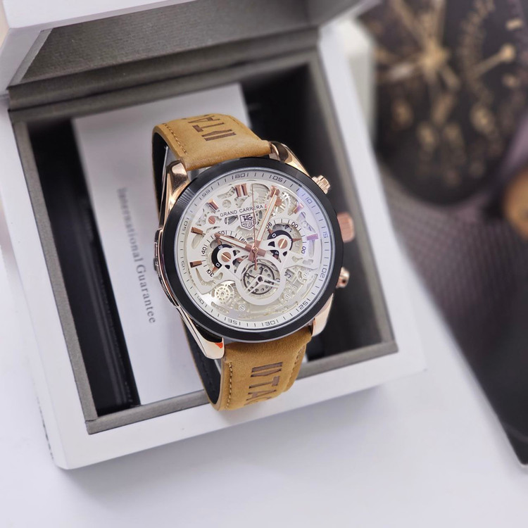 تگ هویر کررا مناسب آقایان سه موتور فعال دارای روز شمار قفل پروانه ای بند چرمی کرنوگراف صفحه خاص وجذاب
